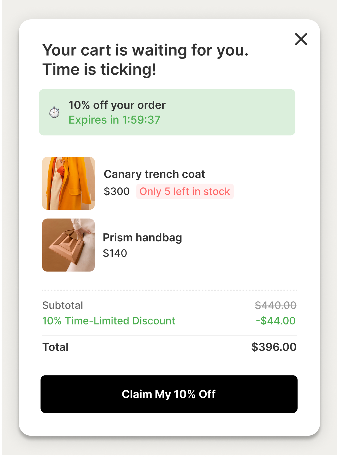 Instant Rewards. Reveal discounts and offers directly in the popup instead of sending them via follow-up email. This approach generates more code applications and recovers an additional 8–14% of abandoning mobile shoppers