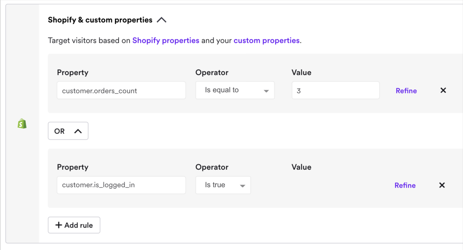 Shopify-specific popup campaign settings with an offer for customers who logged in to their accounts and previously made three purchases: