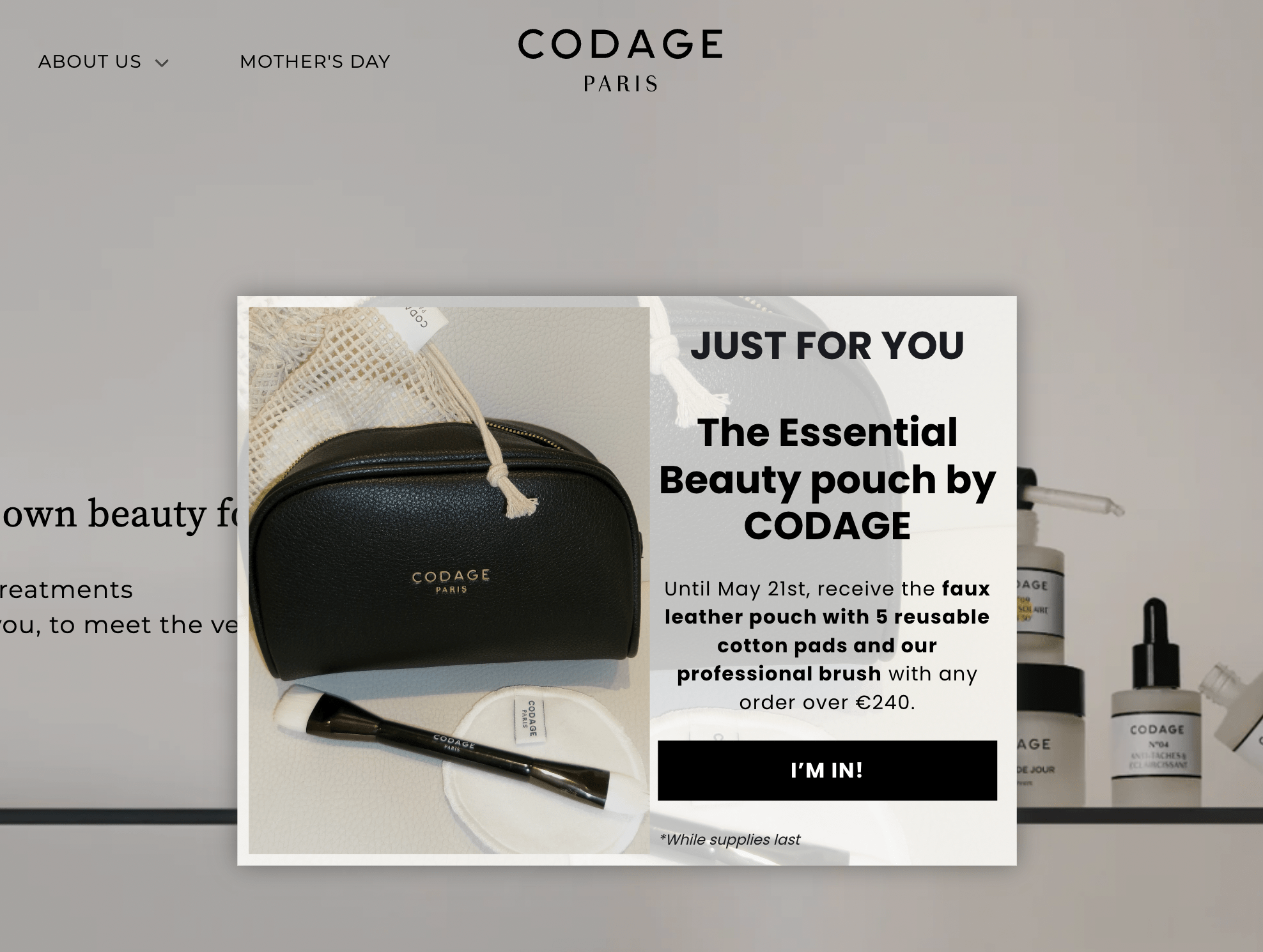 This left-cornered popup (below) at Atelier D'amaya offering a €6 discount for orders over €60 is designed to improve average order value—not capture emails. To make sure that the message is seen, the rest of the screen is blurred (this is the so-called lightbox effect).