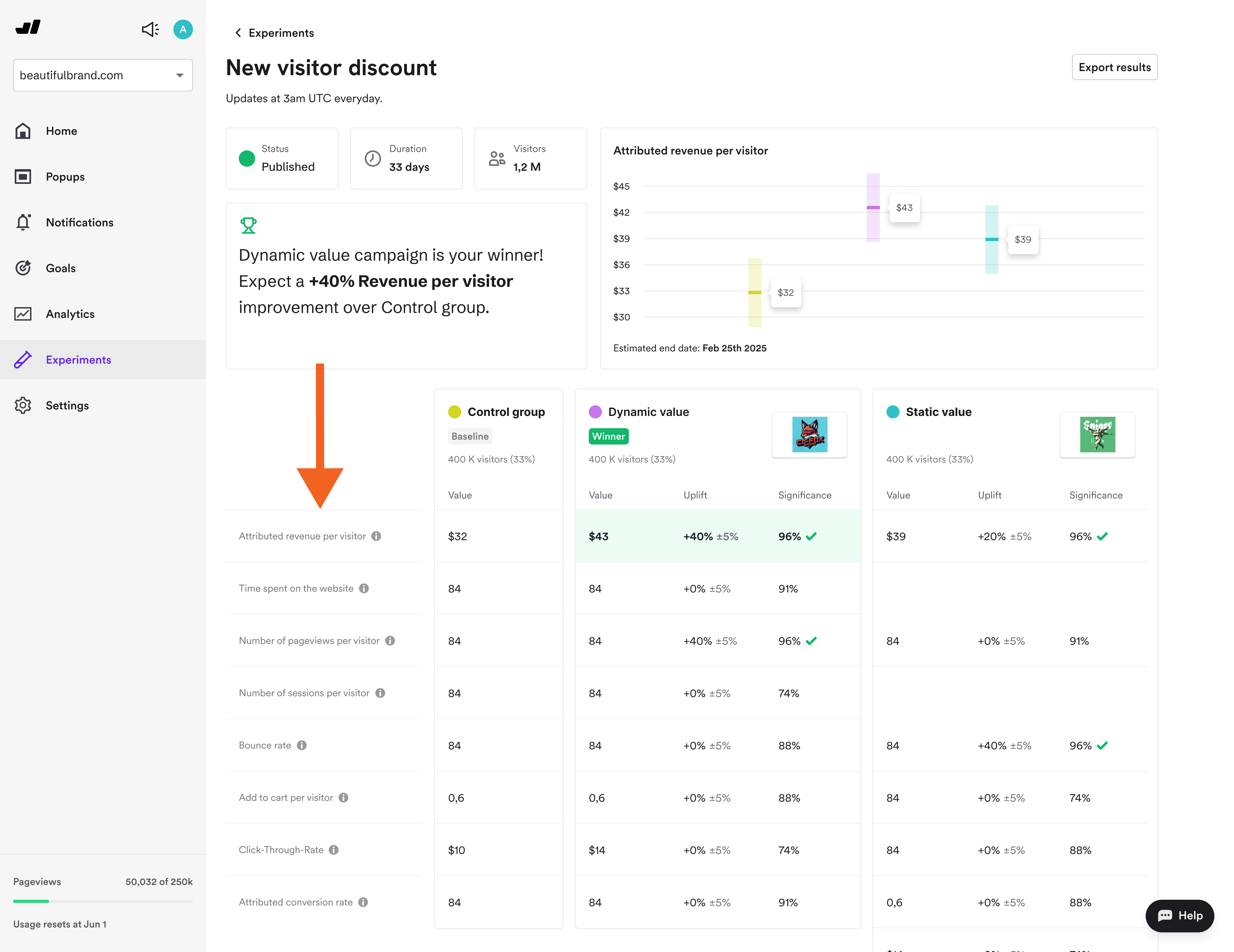Wisepops, for example, tracks everything automatically—plus, you can choose your primary metrics to focus your A/B tests on: