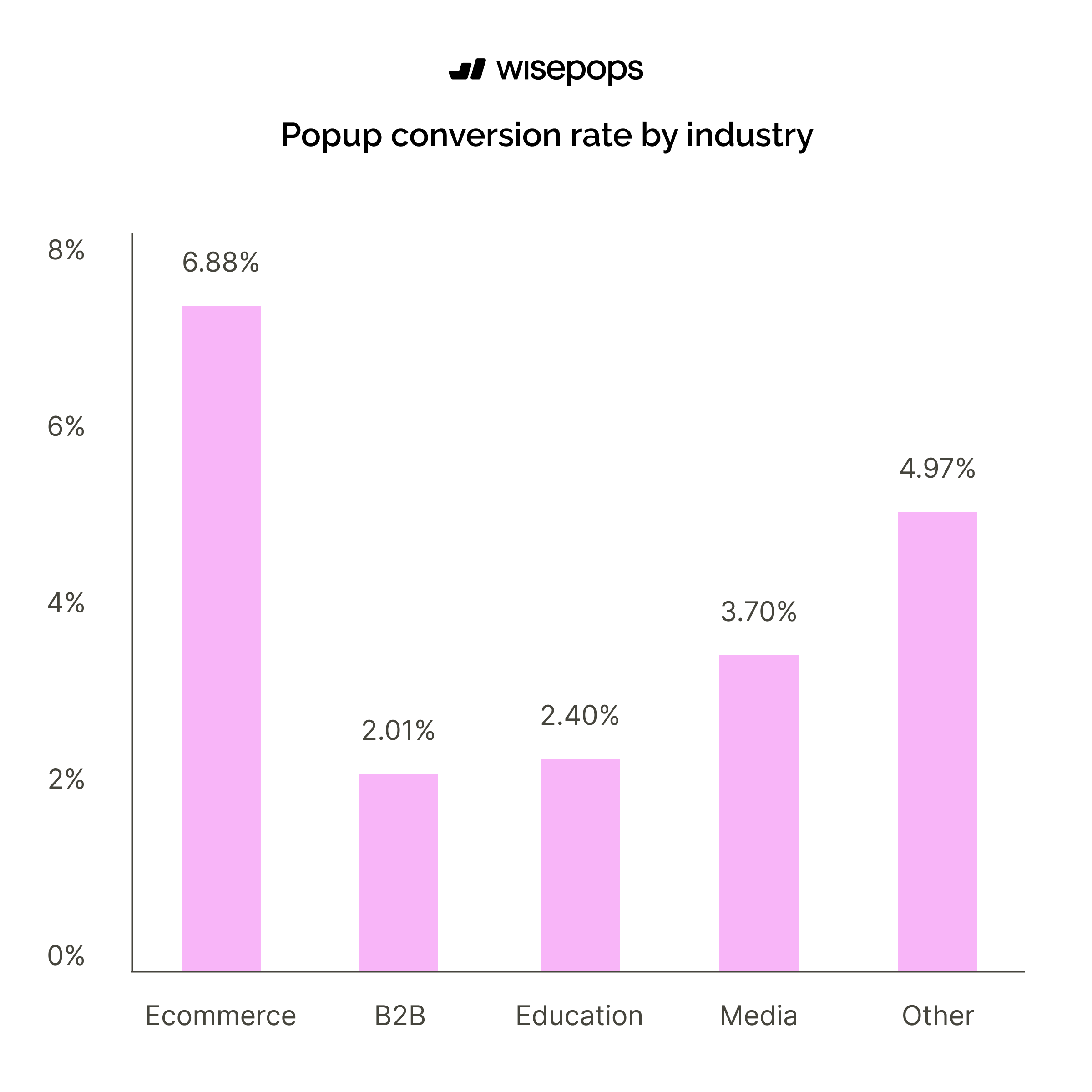 Ecommerce businesses achieve the highest popup conversion rate at 6.88%, followed by Media at 3.70%. Education (2.40%) and B2B (2.01%) industries show significantly lower conversion rates, with B2B having the lowest performance overall.