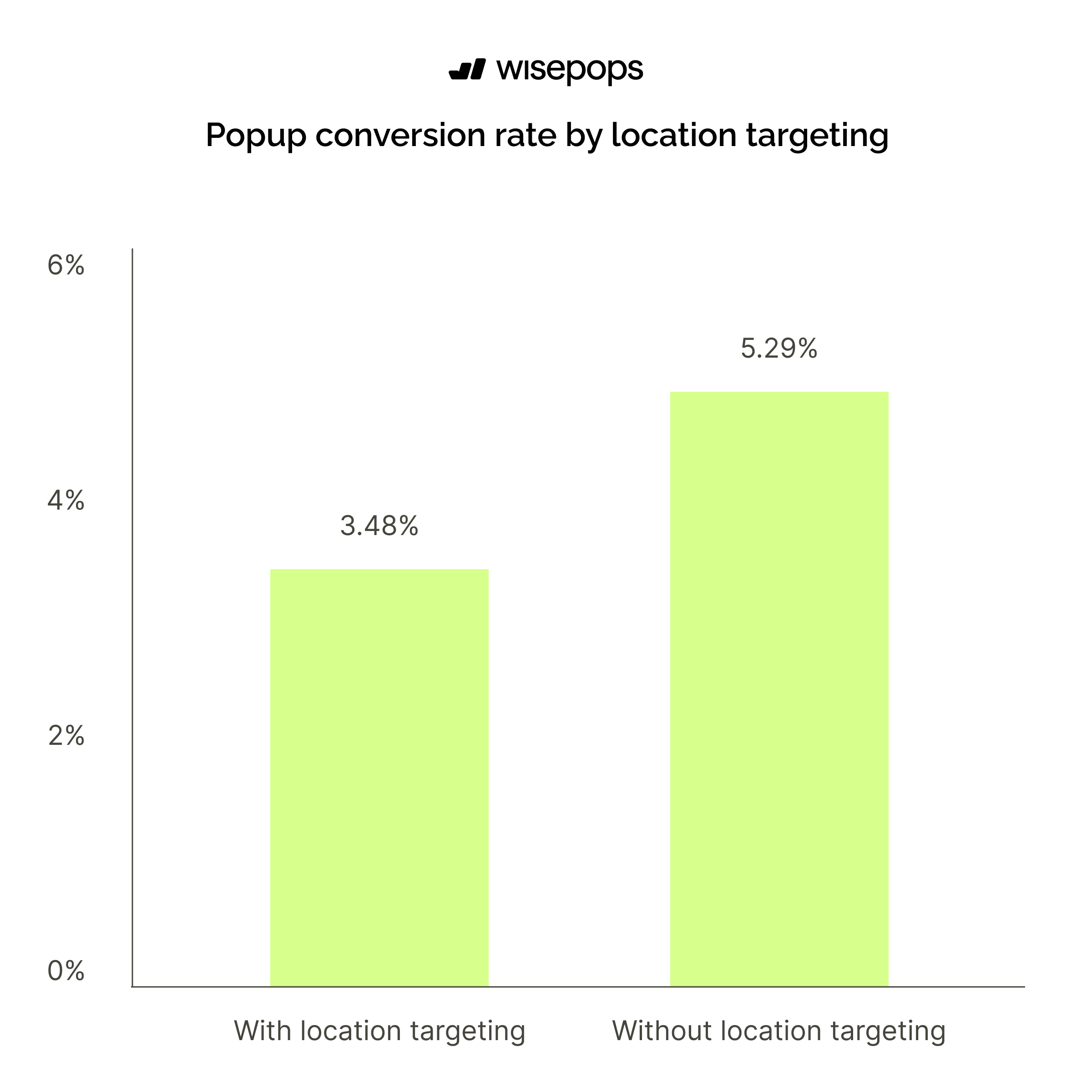 Popups without location targeting achieve a 5.29% conversion rate, while those with location targeting convert at 3.48%.