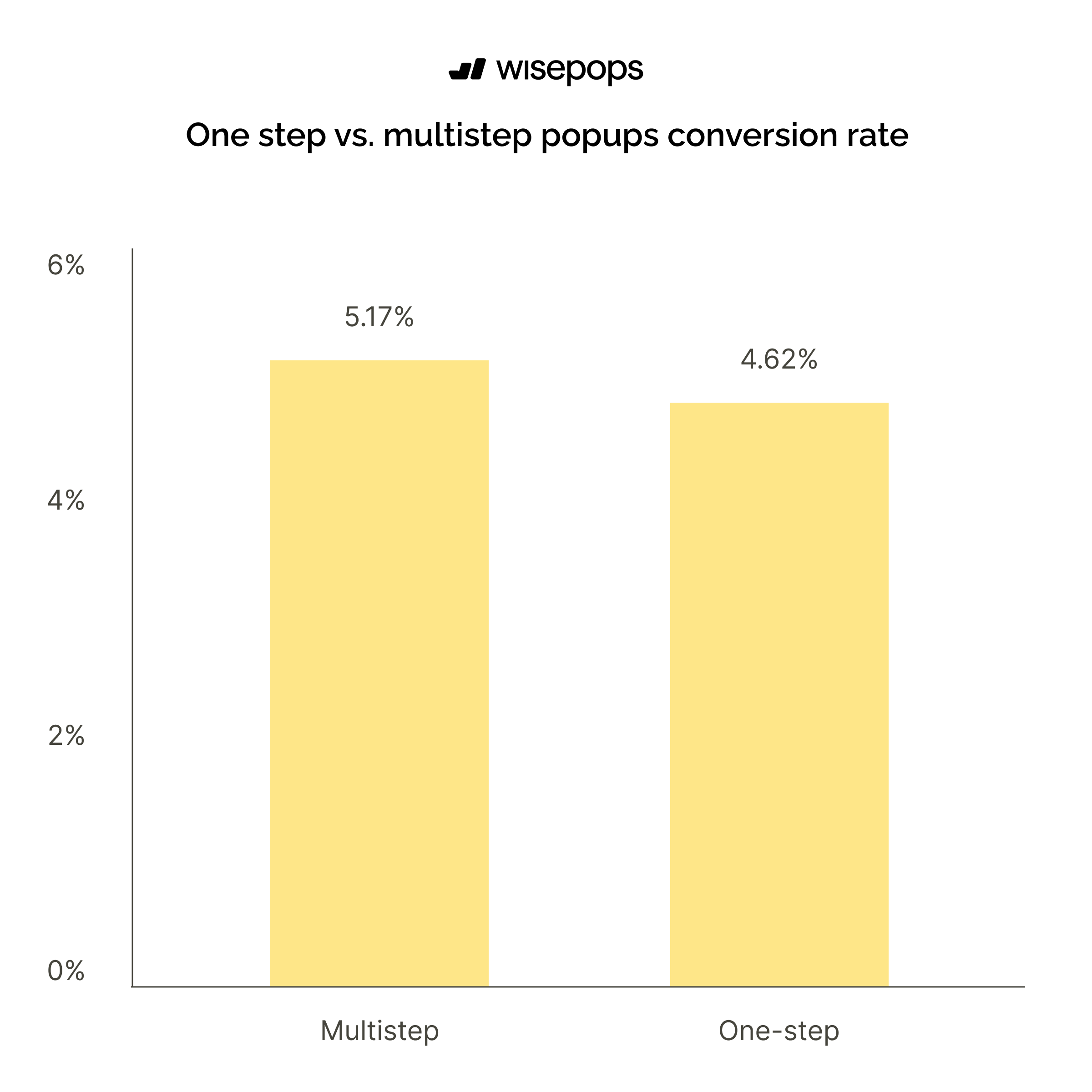 Multi-step popups achieve a 5.17% conversion rate, which is 12% higher than single-step popups at 4.62%.