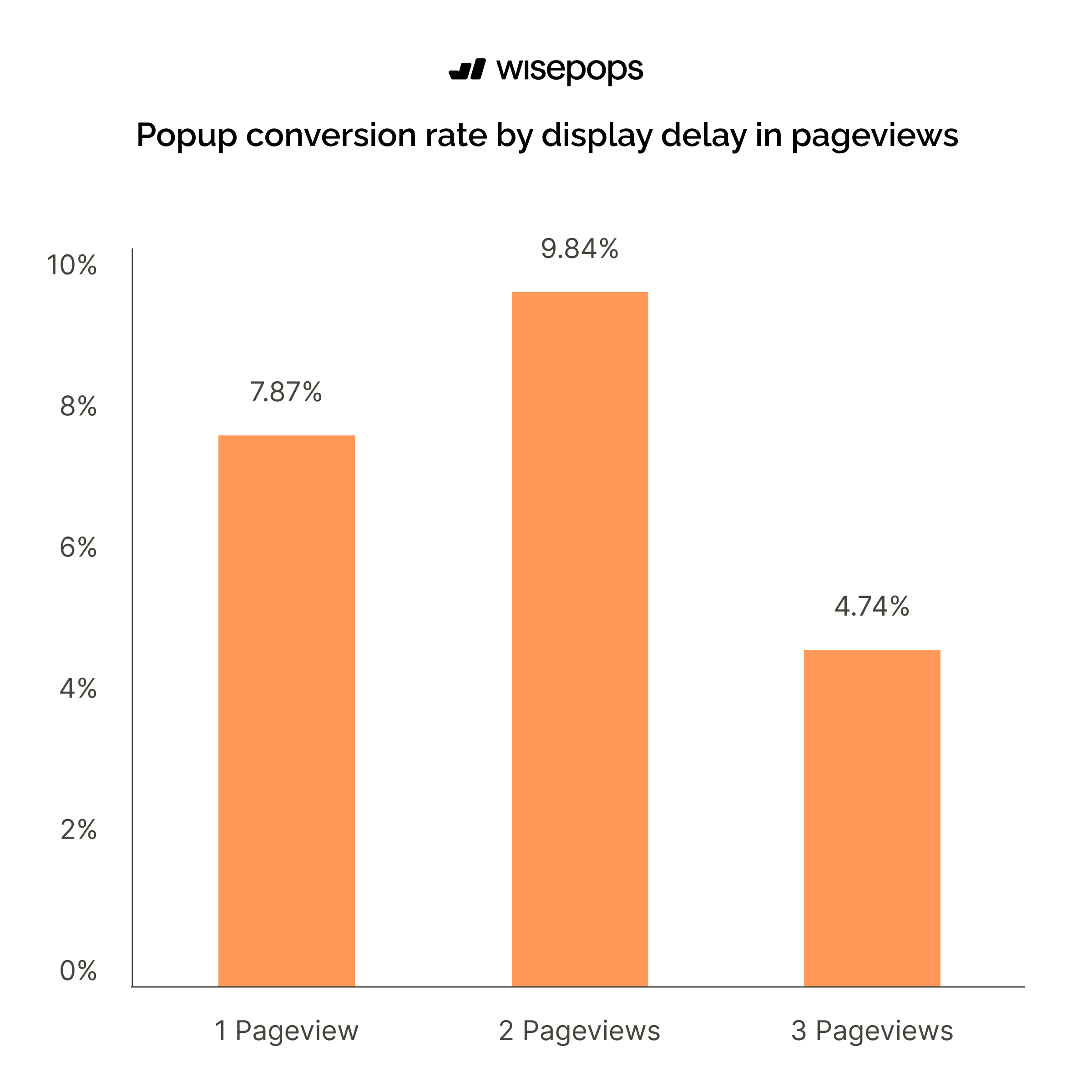 Single-page delays convert at 7.87%, while waiting for 3 pages drops significantly to 4.74%, suggesting that the optimal window for popup display is after visitors have demonstrated initial interest by viewing 1-2 pages but before they become too deep or lose interest.
